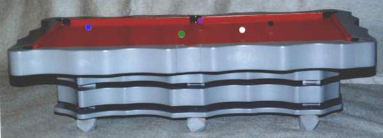 Abb.: Holzart geformtes MDF-grau lackiert Tuchfarbe: rot Ein von natürlichen Formen inspirierter Billard. Sein gewelltes Äußeres verleiht diesem Tisch ein unverwechselbares Aussehen, ohne das sich dabei die Wellenform umlaufend wiederholt. Eine gelungene Verbindung zwischen exklusivem Möbelstück und Billardtisch. Ein sehr außergewöhnlicher Blickfang für jeden Wohnbereich. Dieser Tisch besitzt eine sehr geschlossene Bauart, die jedoch durch unterbrochene Ebenen nicht wuchtig wirkt Die Tischhöhe ist verstellbar und beträgt 79 cm - 81 cm. Der Sockelkörper besteht aus mehreren einzelnen Teilen. Spielfläche und Bandenrahmen liegen schwingungsfrei auf einem Trägerrahmen. Spielfläche und Bandenrahmen liegen auf einem verstellbaren Trägerrahmen um event. Unebenheiten des Bodens auszugleichen. Die Ballfangtaschen bei den Poolmodellen sind in den Bandenrahmen eingelassen. Für den Transport läßt sich der Tisch komplett zerlegen. Der Bandenrahmen besteht aus mehreren Teilen. Sie können Wählen: Holzart: Buche, Eiche, Esche, Erle, Mahagoni, Nußbaum, Kirsche, Ahorn, Wenge, Teak. Oder Lackierung in ca. 170 RAL- Farben. Lackierungen alle seidenmatt. Sonderausführungen auf Wunsch möglich. Tuch-Bespannung: Grundausstattung Grün oder Blau, Rot, Grau, Schwarz. Technische Änderungen vorbehalten, Zubehör ist nicht im Preis enthalten. Preis inkl. gesetzlicher Mehrwertsteuer: ab 7.090.- € Carambolage 1 Außenmaß: ca. 140 x 245 cm Spielfeld: 105 x 210 cm. Mindestraumbedarf: 305 x 410 cm. Spielfeld aus spezialbeschichter Verbundplatte (30mm 1-teilig) Gewicht ca. 360 kg Bestell- Nr.: 098 11 01 Carambolage 2 Außenmaß: ca. 140 x 245 cm Spielfeld: 105 x 210 cm. Mindestraumbedarf: 305 x 410 cm. Spielfeld aus Naturschiefer (19mm 1-teilig) Gewicht ca. 420 kg Bestell- Nr.: 098 11 02 Pool 1 Außenmaß: ca. 134 x 233 cm Spielfeld: 99 x 198 cm. 7 Ft. Mindestraumbedarf: 299 x 398 cm. Spielfeld aus spezialbeschichter Verbundplatte (30mm 1-teilig) Gewicht ca. 350 kg Bestell- Nr.: 098 11 03 Pool 2 Außenmaß: ca. 134 x 233 cm Spielfeld: 99 x 198 cm. 7 Ft. Mindestraumbedarf: 299 x 398 cm. Spielfeld aus Naturschiefer (19mm 1-teilig) Gewicht ca. 410 kg Bestell- Nr.: 098 11 04 Pool 3 Außenmaß: ca. 147 x 259 cm Spielfeld: 112 x 224 cm. 8 Ft. Mindestraumbedarf: 312 x 424 cm. Spielfeld aus spezialbeschichter Verbundplatte (30mm 1-teilig) Gewicht ca. 380 kg Bestell- Nr.: 098 11 05 Pool 4 Außenmaß: ca. 147 x 259 cm Spielfeld: 112 x 224 cm. 8 Ft. Mindestraumbedarf: 312 x 424 cm. Spielfeld aus Naturschiefer (22mm 3-teilig) Gewicht ca. 470 kg Bestell- Nr.: 098 11 06 Pool 5 Außenmaß: ca. 162 x 289 cm Spielfeld: 127 x 254 cm. 9 Ft. Mindestraumbedarf: 327 x 454 cm. Spielfeld aus spezialbeschichter Verbundplatte (30mm 1-teilig) Gewicht ca. 405 kg Bestell- Nr.: 098 11 07 Pool 6 Außenmaß: ca. 162 x 289 cm Spielfeld: 127 x 254 cm. 9 Ft. Mindestraumbedarf: 327 x 454 cm. Spielfeld aus Naturschiefer (25mm 3-teilig) Gewicht ca. 550 kg Bestell- Nr.: 098 11 08 Abdeckplatte, 2-teilig zur Verwendung des Billardtisches als Wohn-, Eß- oder Schreibtisch. Passend zum Tisch. Bitte geben Sie bei Nachbestellung die Nummer und Farbe des Tisches an Bestell- Nr.: 098 11 10 Anspielpunkte in den Rahmen eingelassen, nicht aufgedruckt. Bestell- Nr.: 098 11 11 Spielfertige Aufstellung auf Anfrage. Weitere Größen für Carambolage auf Wunsch möglich! |